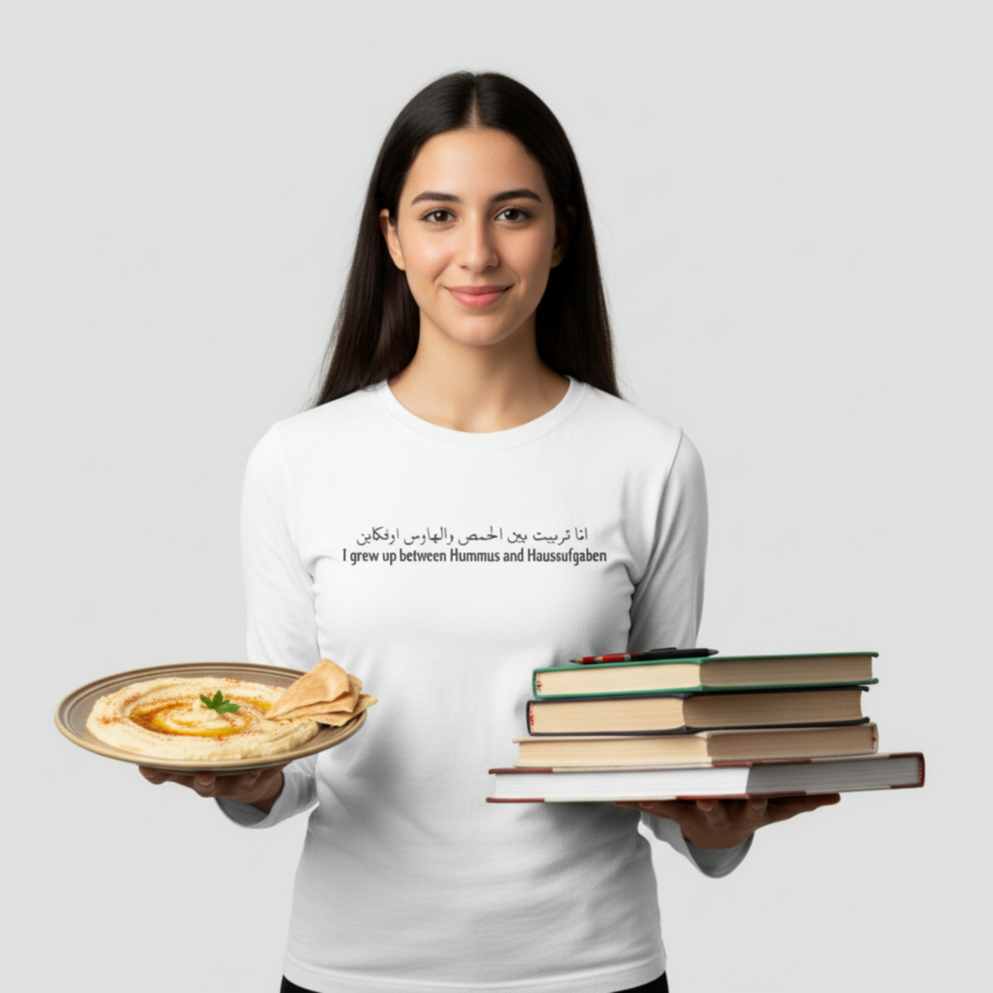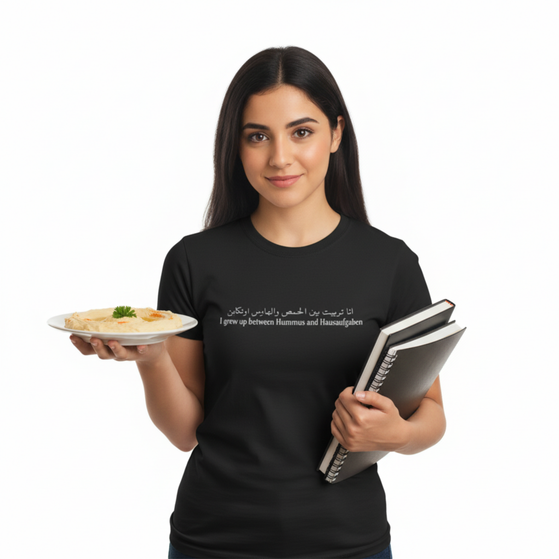 Frontprint: „أنا تربيت بين الحمص والواجبات // I grew up between Hummus and Hausaufgaben