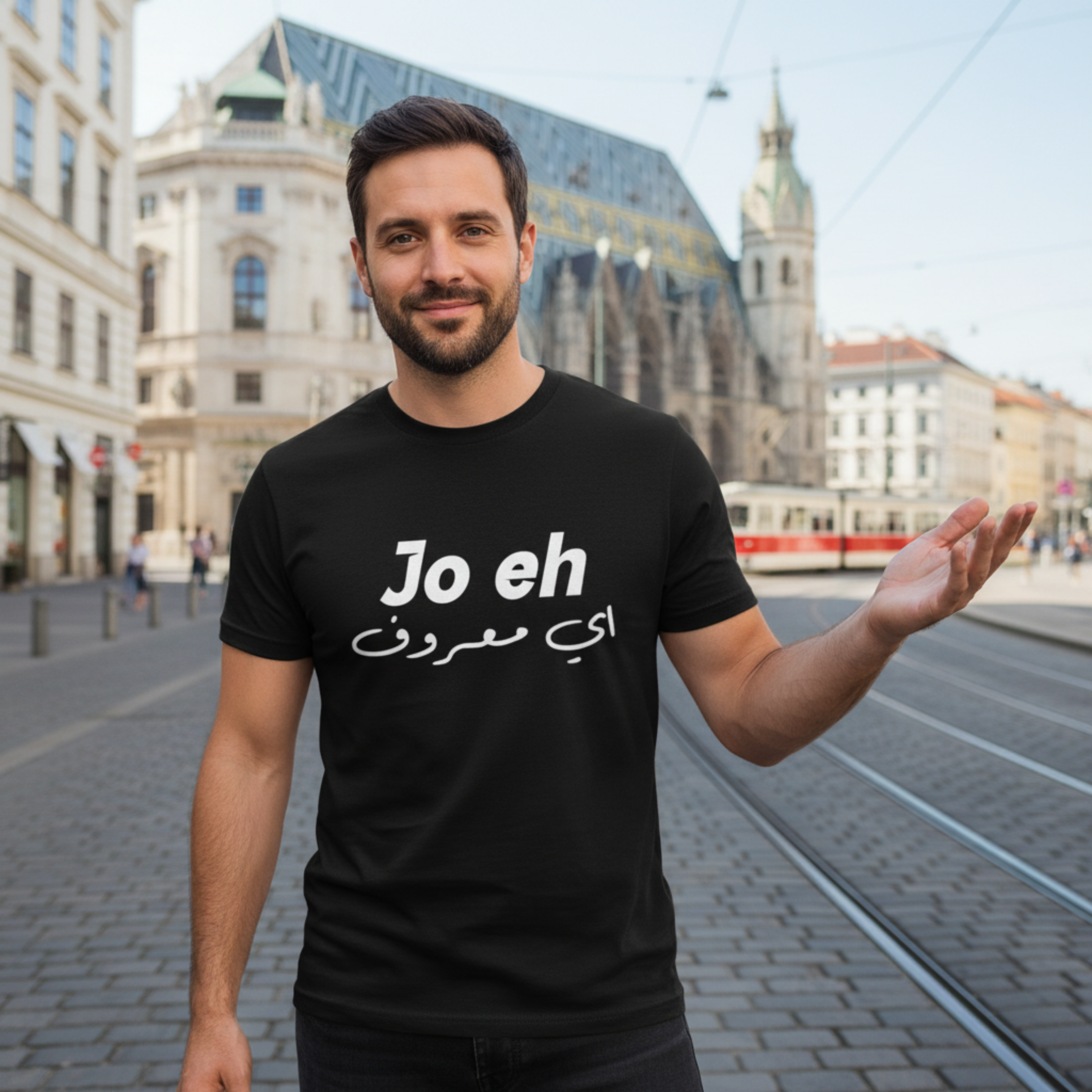 Dieses T-Shirt bringt einen kurzen Wiener Ausdruck zusammen mit arabischer Alltagssprache. Direkt formuliert. Ehrlich getragen.