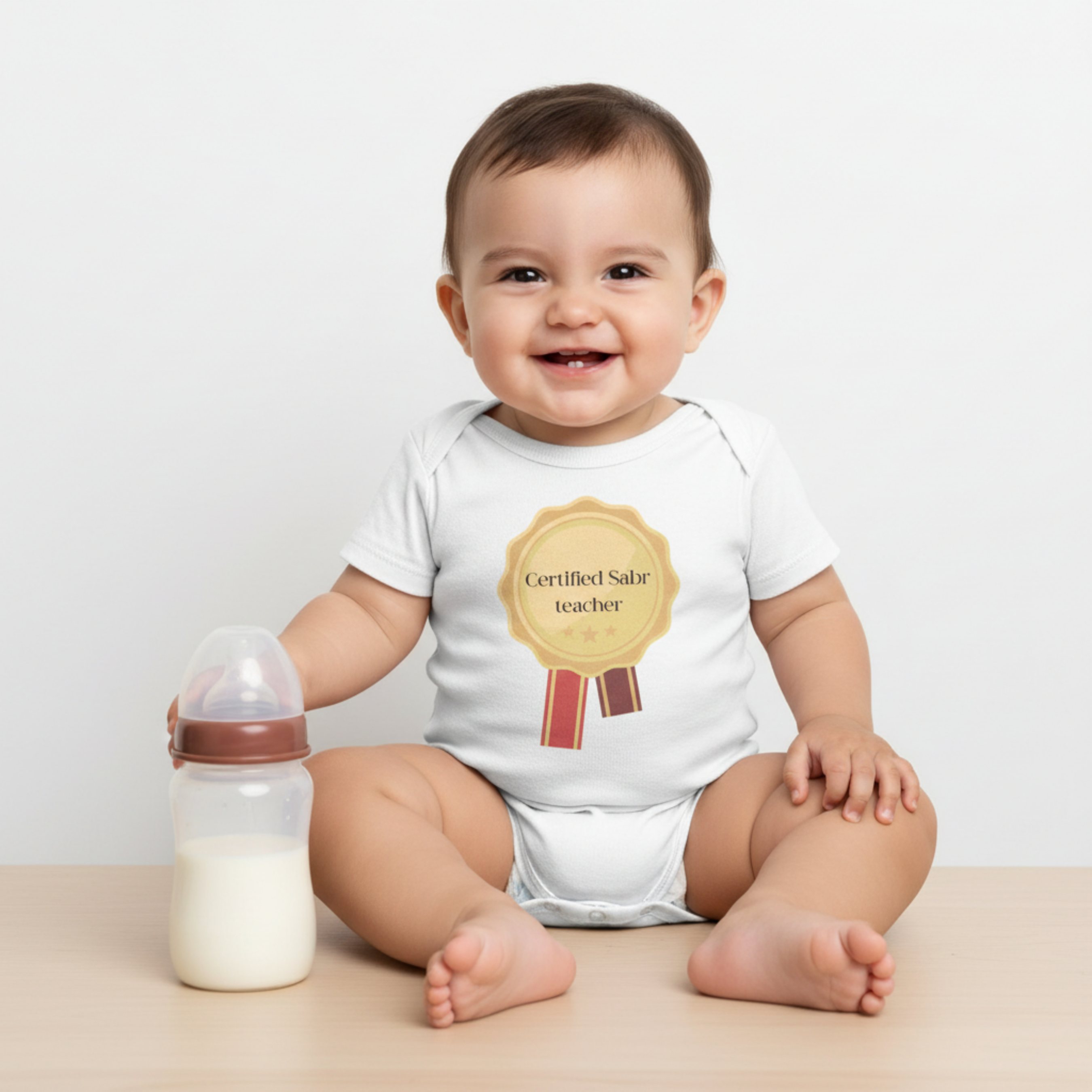 Dieser Baby Body trägt den Aufdruck „Certified Sabr Teacher“ und greift mit einem Augenzwinkern eine Erfahrung auf, die viele Eltern kennen. Babys lehren Geduld, jeden Tag aufs Neue. Der Body verbindet Humor mit Bedeutung und passt gut in den Alltag junger Familien.